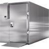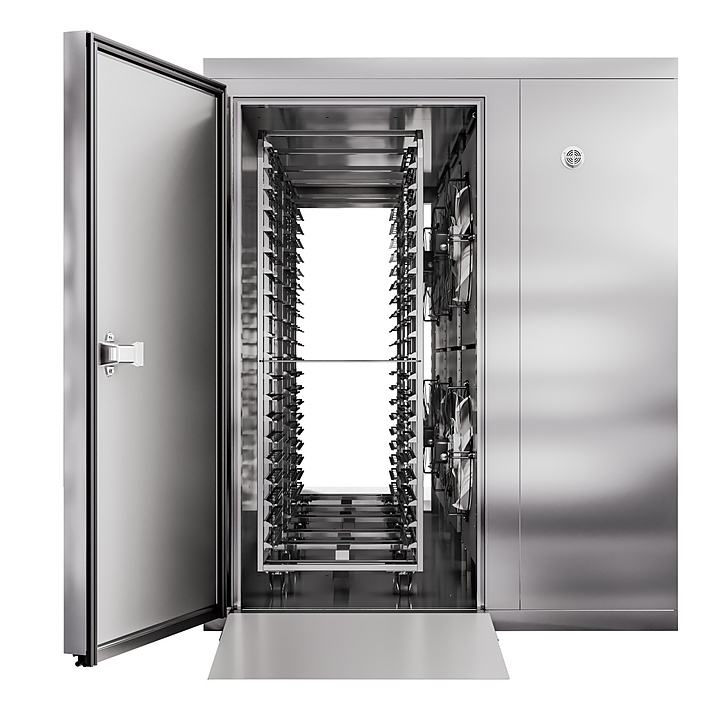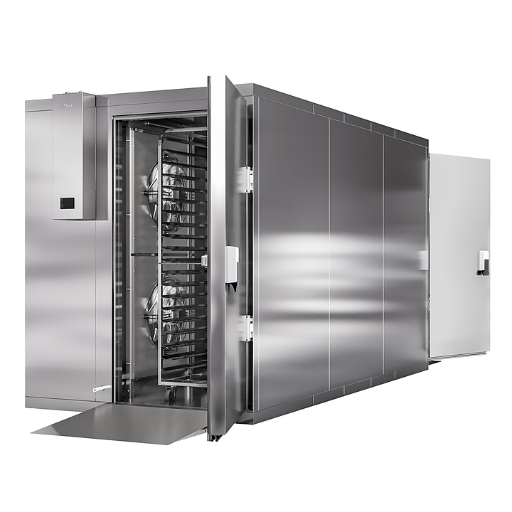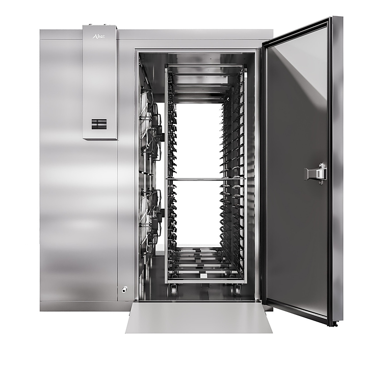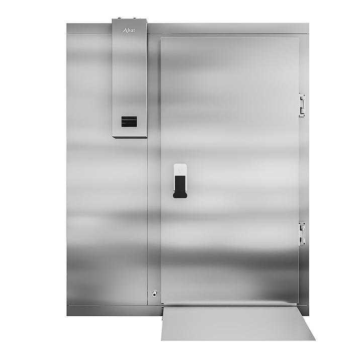 Камера шоковой заморозки Abat ШОКК-203 предназначена для быстрого охлаждения и замораживания различных пищевых продуктов и полуфабрикатов для дальнейшего их хранения на низкотемпературных складах предприятий общественного питания. Модель оснащена 3 воздухоохладителями с 2 вентиляторами каждый, навесными дверьми с низкотемпературным уплотнителем, подогревом и двусторонним замком. Пандусы и пол камеры выполнены из рифленого нержавеющего листа, стенки и потолок – сендвич-панели из высококачественной нержавеющей стали толщиной 80 мм.