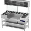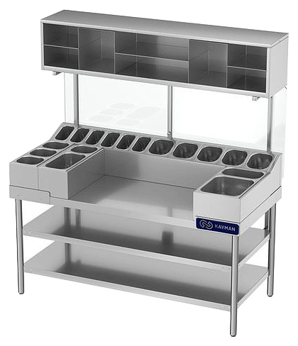 Блинная станция KAYMAN СП-Б-1500 А предназначена для комплексного оснащения рабочего места приготовления и раздачи блинов с начинкой на предприятиях общественного питания и торговли. Модель оснащена съемными холдерами для размещения гастроемкостей под тесто и начинки и пространством для установки электрической блинницы БЭ-2-360 А или газовой блинницы БГ-2-360 А. Стойки каркаса выполнены из трубы 40 мм нержавеющей стали, все остальные конструктивные элементы – из нержавеющей стали.